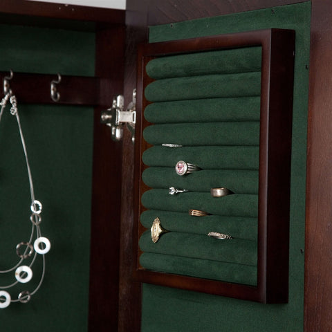 Save space in your bedroom and add a heightened level of organization to your daily routine with this Wall Mounted Locking Jewelry Armoire Cabinet in Espresso Wood Finish that doubles as a full-length mirror. Inside the cabinet are hooks, trays, shelves, and slots to organize all of your jewelry, from rings to necklaces. The cabinet is made of sturdy wood and comes in a cherry, oak, white, or espresso finish to match any bedroom design. The cabinet door locks, so you don't have to worry about anyone accessing your jewelry without your permission.
