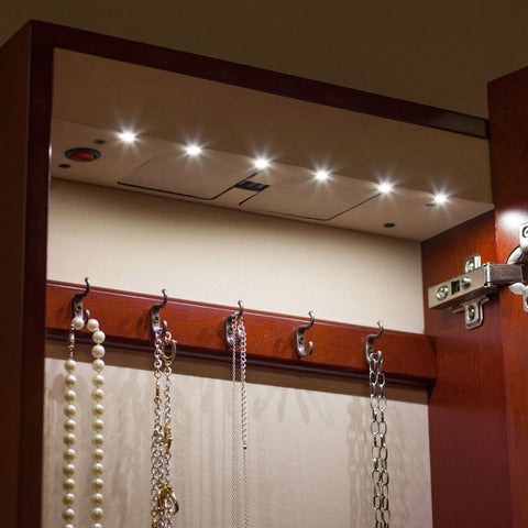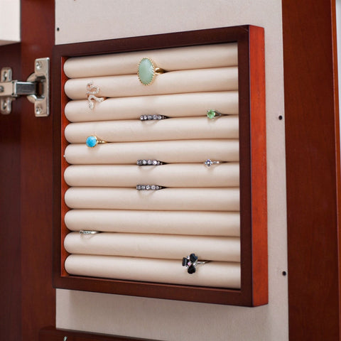 This Wall Mounted Locking Jewelry Armore with Mirror in Cherry Wood Finish reflects your good taste in home decor as well as your smart ensemble. Once you've chosen the best accessories for your outfit from the selection stored inside, you'll use the mirror for a final glance as you depart for work, an evening out with friends or any other occasion. Traditional in style, finished in an elegant cherry hue, yet modern with its LED lights tucked inside this casement for easy accessory selection, this space-saving piece of furniture will provide organization to your treasured pieces. The numerous hooks, trays, shelves and slots will store necklaces, earrings, rings, bracelets, watches, pins and more, nestled against the soft, felt-lined interior.
