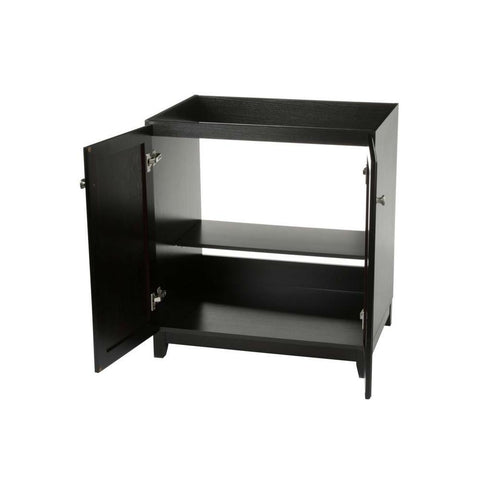 This Espresso Bathroom Vanity Cabinet 30 x 21 inch - Top Sold Separately provides both style and storage space in your bathroom. This cabinet has concealed hinges for a clean look, and comes in a dark espresso finish. The vanity top and faucet are not included with this cabinet. The cabinet measures 30-inches by 21-inches and comes with satin nickel hardware. The two cabinet doors open to include an adjustable shelf that customizes your storage space to your needs. The cabinet is made of solid wood frame, legs and leg base, and door centers are MDF with Birch veneer. The finish is durable and water resistant. It comes with a 1-year limited warranty.