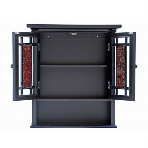 This Espresso Bathroom Wall Cabinet with Amber Mosaic Glass Accents offers sleek lines for a modern look. This cabinet features two glass doors centered with amber mosaic glass accented with grid-work design and beveled molding. This unit offers plenty of storage space with one open shelf and one interior adjustable shelf making it easy to store items of different heights. Crystal clear door knobs showcase the modern design. This cabinet comes with assembly hardware.