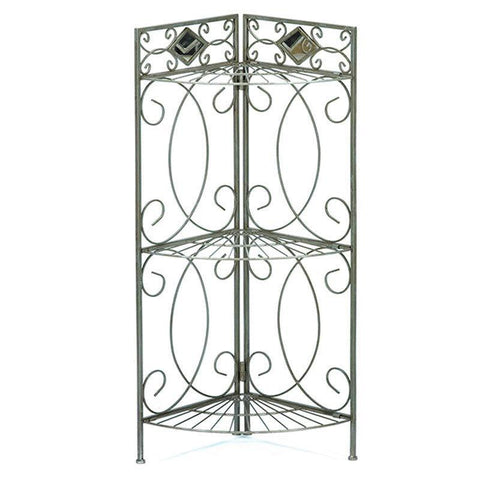Make that neglected little corner of your bathroom functional again with this Spacing Saving Corner Bathroom Linen Rack with 3 Shelves in Pewter Metal Finish. With durable square tubular steel construction and a versatile pewter finish, this little rack will fit perfectly into any corner, offering you extra storage without taking up much space. Three wire shelves are ideal for storing linens, tissue, or other toiletries. This rack features elegant scrollwork and two diamond-shaped mirrors at the top.