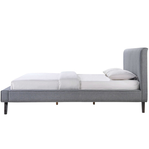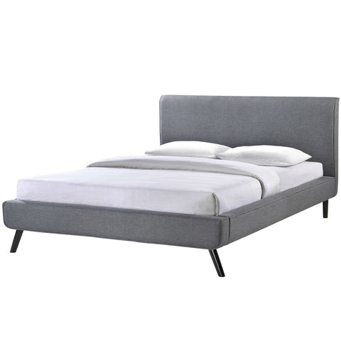 Introduce modernized mid-century decor with this Full size Mid Century Platform Bed with Gray Upholstered Headboard. Built on the design accomplishments of the past, Delve combines concise lines with an iconic flair for one remarkable result. Featuring fine polyester upholstery over MDF boards, tapered solid wood legs, and a sturdy MDF board support system, Delve adds exceptionalism to your mid-century or eclectic bedroom decor by reminding us all of the design essentials that got us here to begin with. This installment of the bedroom series is a platform bed. Headboard included. Box spring not required.
