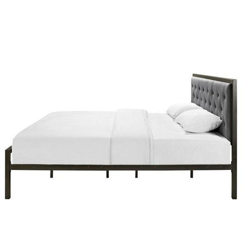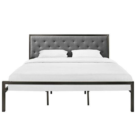 - King size Modern Metal Platform Bed with Gray Button Tufted Headboard