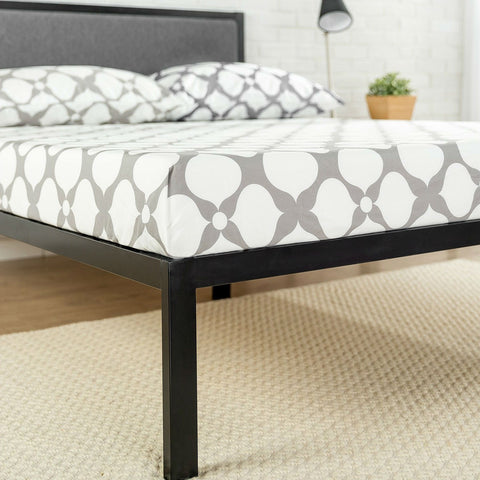 This Queen size Metal Platform Bed Frame with Wood Slats and Upholstered Headboard features wooden slats that provide strong support for your memory foam, latex, or spring mattress. 14 inches high with 12 inches of clearance under the frame for plenty of under bed storage space. This strong, metal platform bed features a grey, foam cushioned, upholstered headboard adding style and comfort to your bedroom.