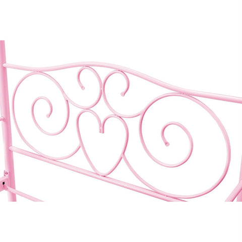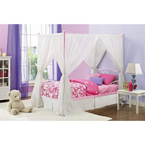 Make bedtime more enticing with this Twin size Sturdy Metal Canopy Bed in Pink. The embellished heart scroll design on both the headboard and footboard evoke an elegant, yet fun look to your princess’s room. The four canopy posts, topped with gracious finials add the finishing touches to this delicate piece. Highlight its beauty even more by placing sheer curtains over the posts. The layered effect creates a special place for your little girl to play and sleep. Designed to fit a standard twin mattress, this bed includes metal slats that eliminate the need of a box spring.