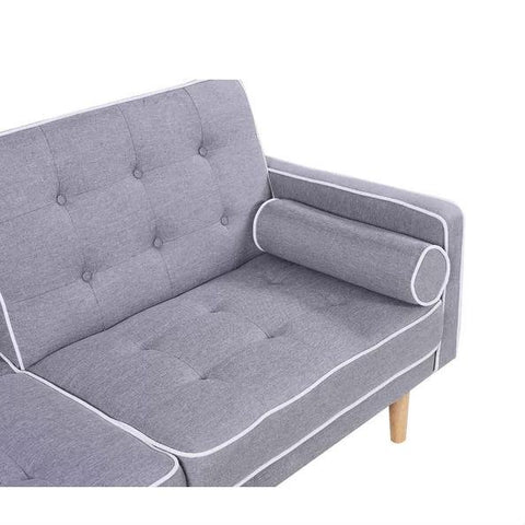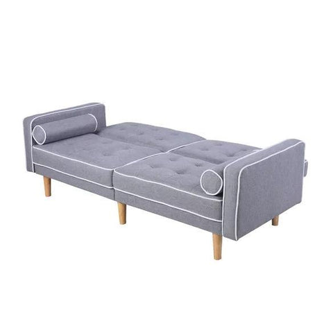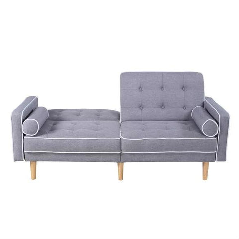 This Light Grey Linen Upholstered Sofa Bed Modern Mid-Century Classic comes with 2 cylinder shaped accent pillows and features a splitback design to accommodate individual preferences. Upholstered in a soft linen with a white piping border and dark wood finished legs to add a sense of style. Simple and sleek.