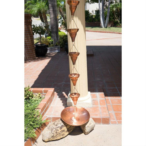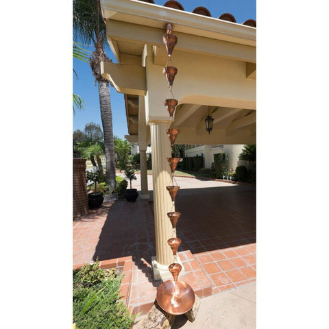 A stylish replacement for your conventional rain spout as well as a charming garden accent, this Copper 8.5 Ft Floral Funnel Rain Chain Gutter Downspout is perfect for enjoying the sight of rain water cascading to the ground as it flows from cup to cup. Hand-crafted of solid copper and fashioned after traditional Japanese rain chains, which have been used for hundreds of years to break the flow of water, this rain chain boasts extra large flower-shaped cups that add elegance to any setting. Simply insert the rain chain in your existing rain gutter drain hole instead of the downspout and you'll be able to enjoy the soothing sight and sound of water flowing down whenever it rains. Over 8.5 feet long, this rain chain can be shortened or combined with an extension or another unit to get the exact length you need. Includes a copper clip for easy installation. Please note that the copper will naturally develop a beautiful green verdigris patina over time.