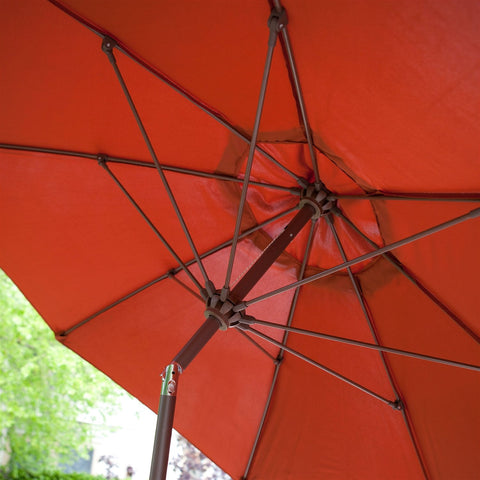 Protect your family from the harsh rays of the sun by adding this 9-Ft Push Button Tilt Patio Umbrella with Rust Red Orange Shade and Bronze Finish Pole to your patio furniture set. This 9-foot tilt umbrella provides shade for a 54-inch table. Purchase an umbrella stand and you can also use this versatile accessory to shade two chairs and a side table. The umbrella is constructed to withstand windy weather conditions, with an aluminum pole and wind-resistant fiberglass ribs that will ensure your umbrella won't collapse. It is available in a variety of vibrant colors to match any patio furniture design.