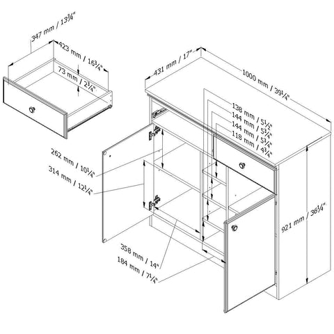 - 2 Closed storage spaces behind each door, separated by 1 adjustable shelf (can support a weight up to 15 lbs)