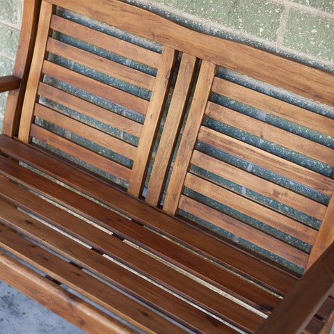 What a beautiful accent piece this Contemporary Outdoor 2-Seat Garden Bench with Weather Resistant Wood Finish will make in your foyer or in your garden. With nice lines and ergonomic design, this bench is constructed of acacia wood, so it will have lasting beauty and durability. The backrest is slightly contoured to help you relax when you lean back into it. Two sections of slatted horizontal panels are set amongst vertical lines for a clean and modern look. The slightly contoured seat features wide planks for a more comfortable surface. Braces between the legs add extra stability. Dimensions: 45L x 23W x 36H inches. Product weight: 35 lbs. Recommended weight capacity: 275 lbs.
