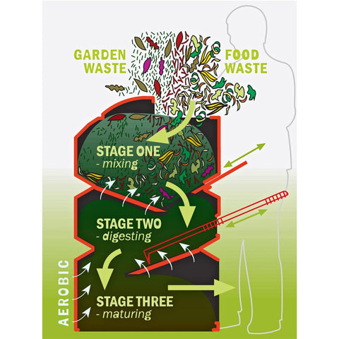 This Heavy Duty 16.4 cubic ft. Soil-maker Compost Bin with 3 Chamber Composter Design is eco-friendly, natural, organic, and easy. It has a unique aerobic process supports new waste material on shelves above the ground. Radiant heat absorbed by the black plastic top, and heat naturally generated by the decomposition process, draws air up through the ventilation holes under the compost material. Aeration is increased when compost material loosens as it spills from shelf to shelf. Oxygen is needed for microbes to break down organic waste efficiently – so aerobic composting is faster!