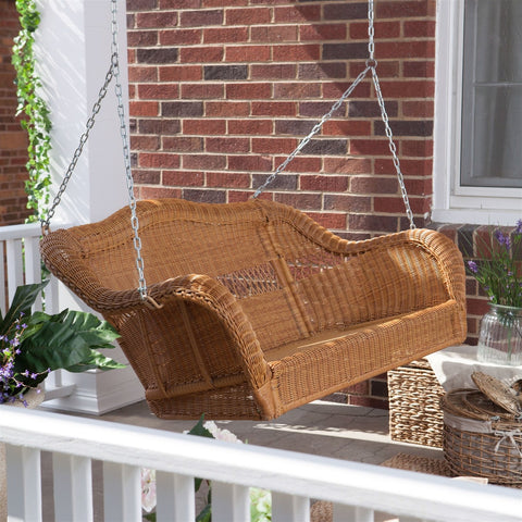 - Honey Resin Wicker Porch Swing with Comfort Spring and Hanging Hooks