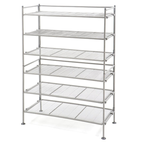 Keep your shoes organized with this Iron 3-Tier Folding Shoe Rack. Features removable mesh panels for connecting multiple shoe racks together. Folds flat for easy storage. No tools required for easy set-up. This shoe rack measures 26.5-inch by 12.2-inch by 19.1-inch high.
