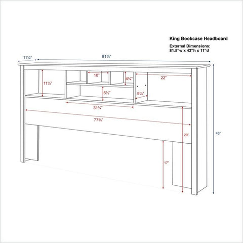 This King size Bookcase Headboard in Espresso Wood Finish has 6 compartments, providing ample space for bedside reading materials, clocks, photographs and decorative accessories. It can be used with any King sized bed frame or is an ideal companion with platform storage beds. This product is made from composite woods with an attractive MDF top and moldings. Product ships flat-packed and self-assembly is required. Detailed and easy-to-follow instructions are included.