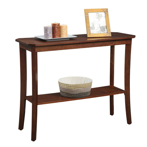 The Mahogany 2 Tier Console Table is a simple timeless piece that will fit the needs of any home. Featuring a rich mahogany woodgrain finish, and a bottom shelf for additional storage or display area this piece will easily complement any decor.