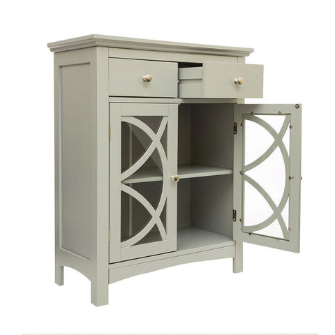- The perfect combination of modern style and ample storage space, it features two glass doors, two drawers and one enclosed adjustable shelf