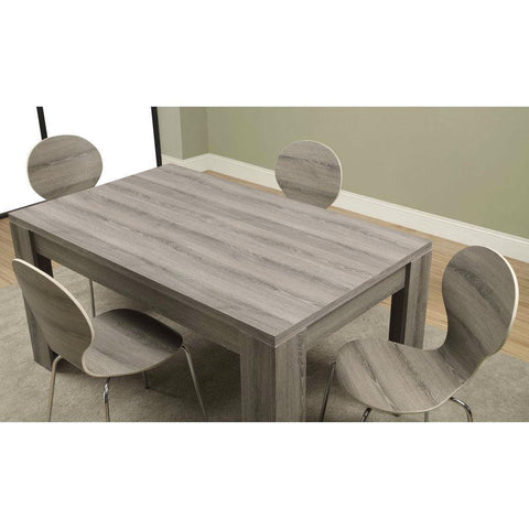 Make a modern statement with this Modern 60 x 36 inch Dark Taupe Rectangular Dining Table. Featuring over-sized open block styled legs, a reclaimed look grain pattern and large 36″ x 60″ surface, this piece will be a bold addition to any dining area.