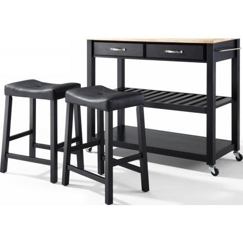- Natural Wood Top Kitchen Cart Island in Black with Saddle Stools