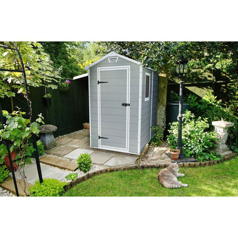 This Outdoor 6-ft x 8-ft Storage Shed in Steel Reinforced Polypropylene is ideal for added storage on any property. The body is crafted from steel-reinforced polypropylene resin, a material that has the texture and look of wood but is actually a rugged material that's resistant to moisture, UV exposure, wind, snow and insects. The heavy duty floor panel offers support while the wide double-doors give you plenty of access for loading and unloading of yard equipment, outdoor toys or just those extra boxes of Christmas decorations. A fixed window and skylight give you plenty of light to see what you're doing, while the high-mounted ventilation panel helps prevent the buildup of fumes or musty odors. Your possessions will stay safely inside once you've added a lock to the robust metal door latch. Assembly is simple with standard tools, so reclaim your garage and/or basement and add the traditional styling of this versatile shed to your home.