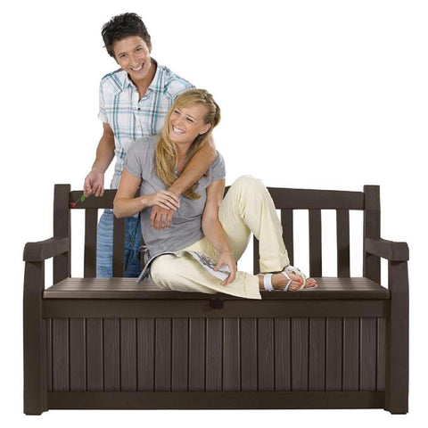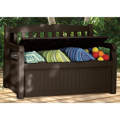 Want to turn your yard into a garden paradise? This Outdoor Garden Bench with Arm Rest and Storage Box in Dark Brown is a great place to start. At first glance, the bench looks like a clean, contemporary wood-style bench with comfortable seating for two adults. But hidden beneath is a large-capacity outdoor storage solution to keep your yard and garden supplies out of sight until needed. The bench is made from high-strength, all-weather and UV-protected resin. It will not warp, rust, rot, dent or peel (and its beige and brown resin never needs painting). The bench is also ventilated, but waterproof to keep contents dry. And to make sure your prized garden angel collection stays safe and secure while you are away from home, the Eden Bench is lockable. It's a storage box. It's practically perfect.