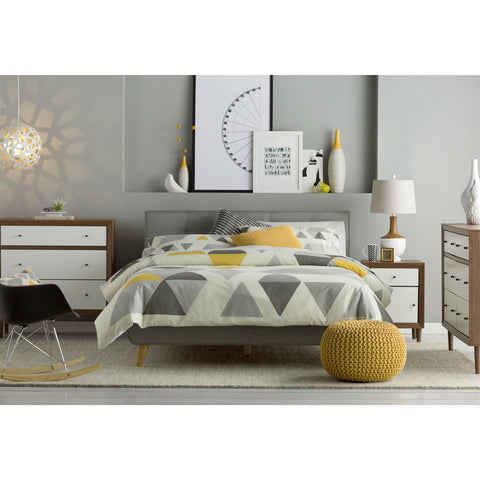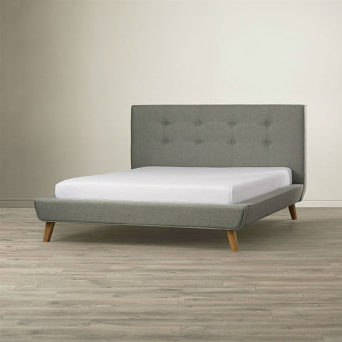 An ideal addition to mid-century suites, this Queen Mid-Century Grey Upholstered Platform Bed with Button-Tufted Headboard elevates a low profile with unmistakably modern details, like a button-tufted headboard and angled wooden legs. Versatile gray upholstery complements any palette you choose throughout the rest of the room.