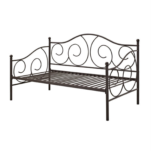 Whether you are looking for extra seating in the living room or a sleeper for overnight guests, this Twin size Scrolling Metal Day Bed Frame in Contemporary Brushed Bronze Dark Pewter is the perfect fit. With round finial posts, a brushed metal frame and traditional scrollwork, this daybed has character that will add instant charm to any room. Sturdily constructed, the bed features metal slats and supporting legs for added support and comfort. No box spring required with this style of bed.